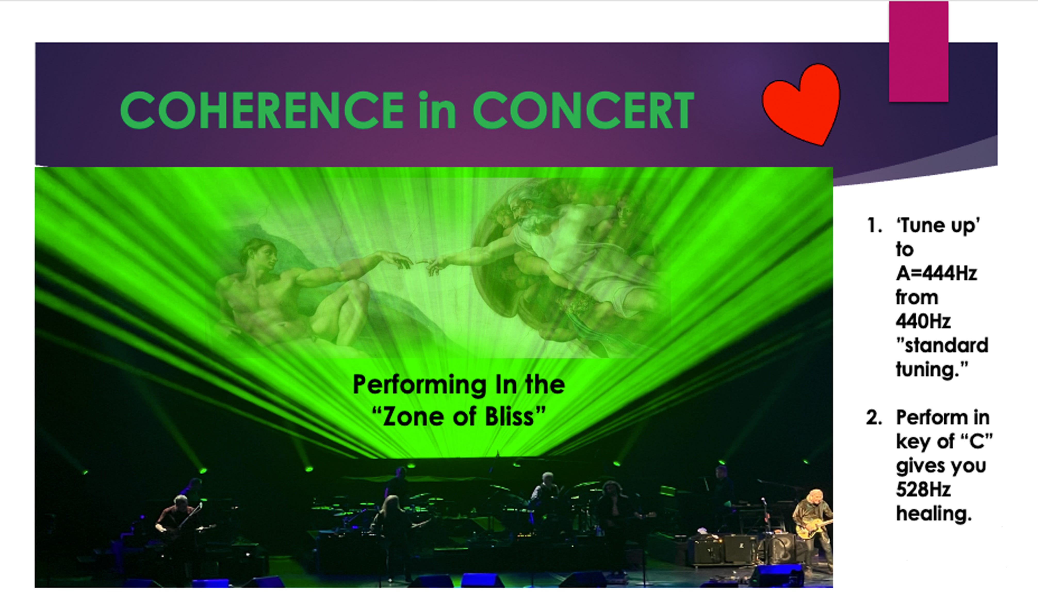 Finally, regarding the importance of Frequency. Below is a slide I generated from my photo of the Eagles concert (2024) broadcasting 528 green light out to the audience. (528Radio.com broadcasts music transposed into 528Hz Frequency.) I titled my slide, “COHERENCE IN CONCERT.” I superimposed Michelangelo’s Sistine Chapel art depicting God touching Man above the words “Performing in the ‘Zone of Bliss.’” On the right side of my slide I prescribe tuning up from A=440Hz “standard tuning” to A=444Hz, to engage the bliss of “C=LOVE 528.” Every single church choir, synagogue cantor, and mosque muezzin should follow these instructions to serve most righteously. This is the spiritual essence of Divine Communion. If the world will ever know “Peace on Earth,” it will come from applying this intelligence.