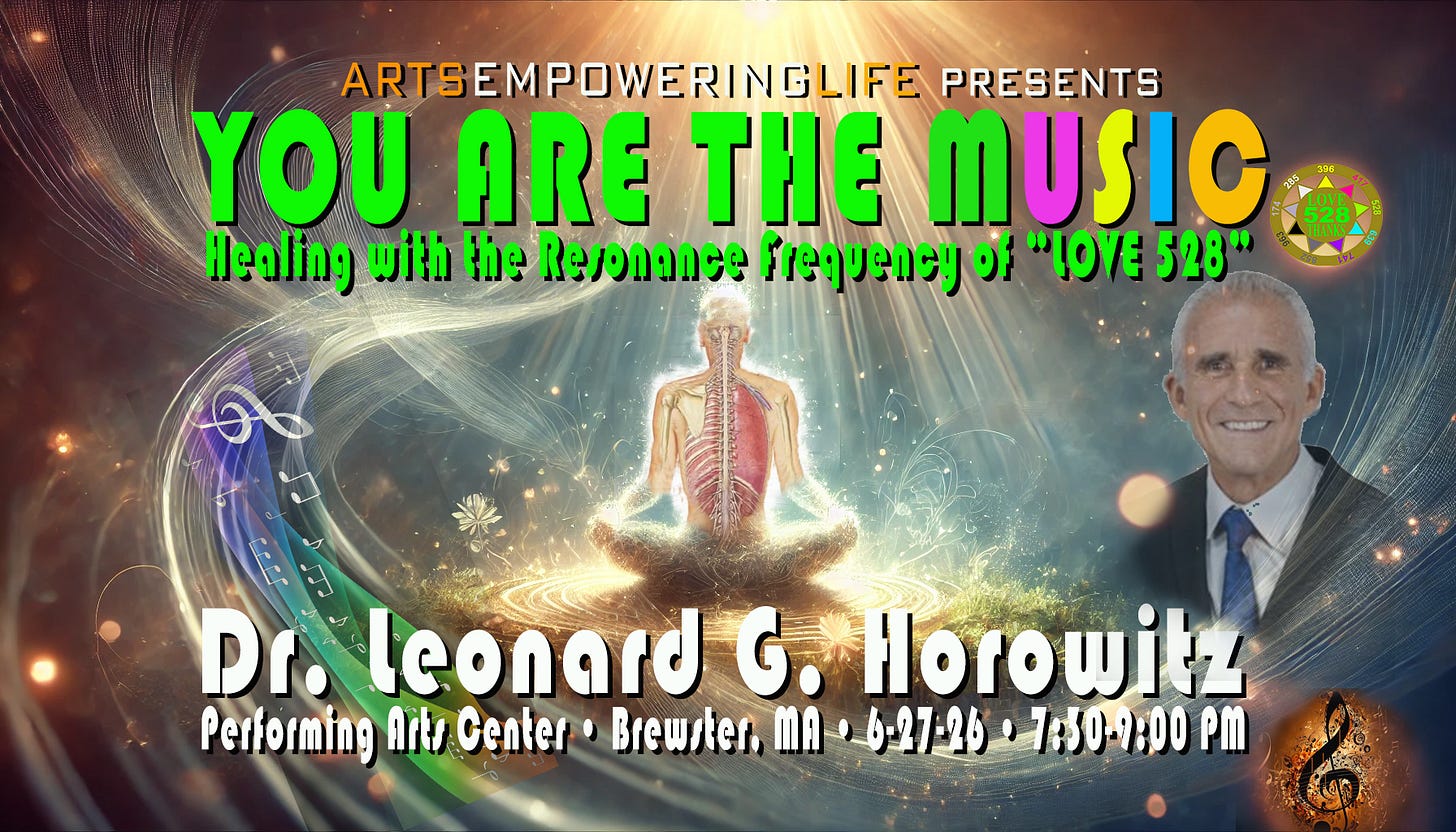 Dr. Horowitz presents profound revelations proving that human beings are literally the “Music of Creation”—living instruments animated and healed by divine mathematical frequencies, with the “LOVE 528” frequency (528Hz sound and 528nm green light) at the heart of miraculous healings, cellular rejuvenation, stem cell differentiation, consciousness evolution, and spiritual salvation.